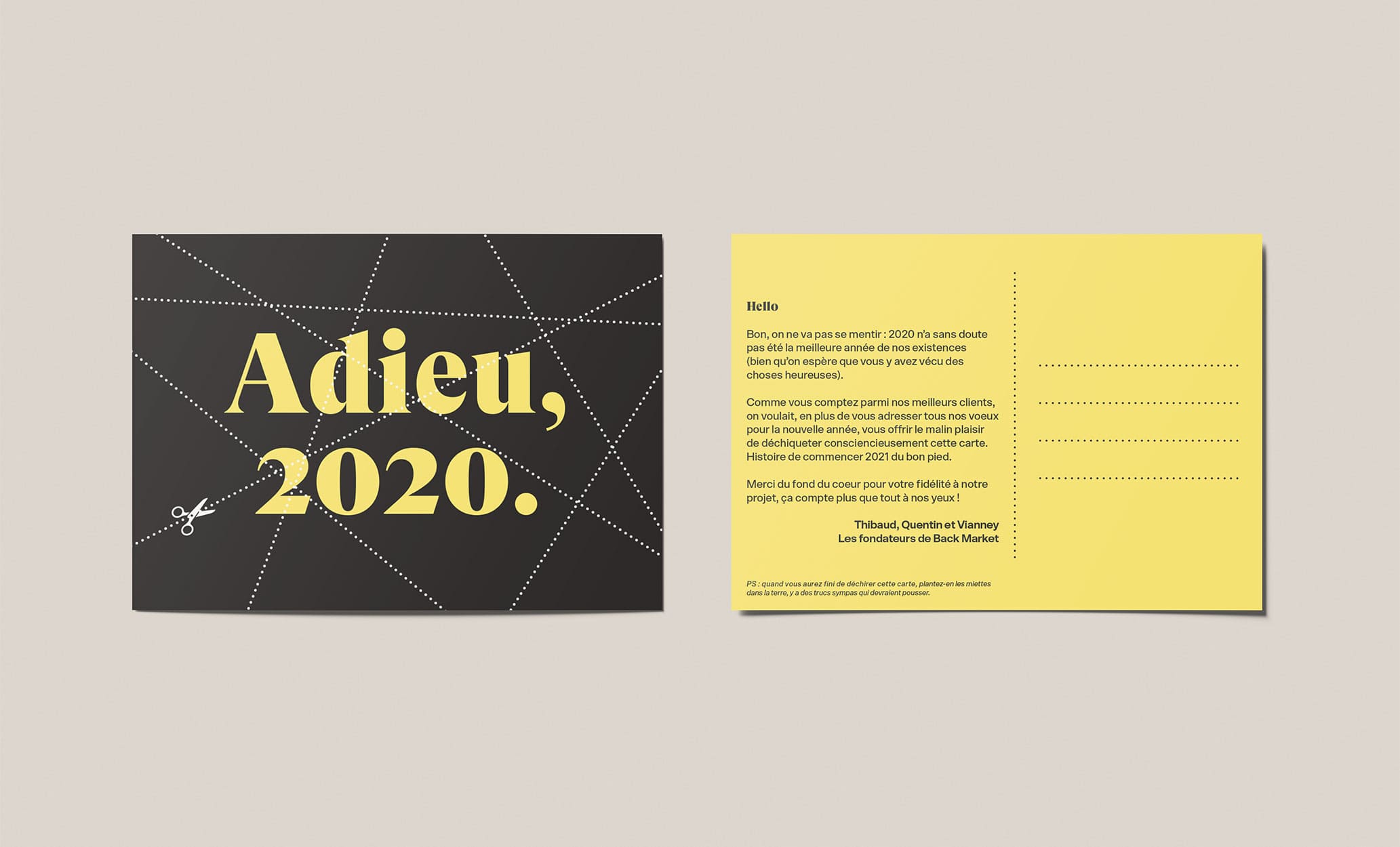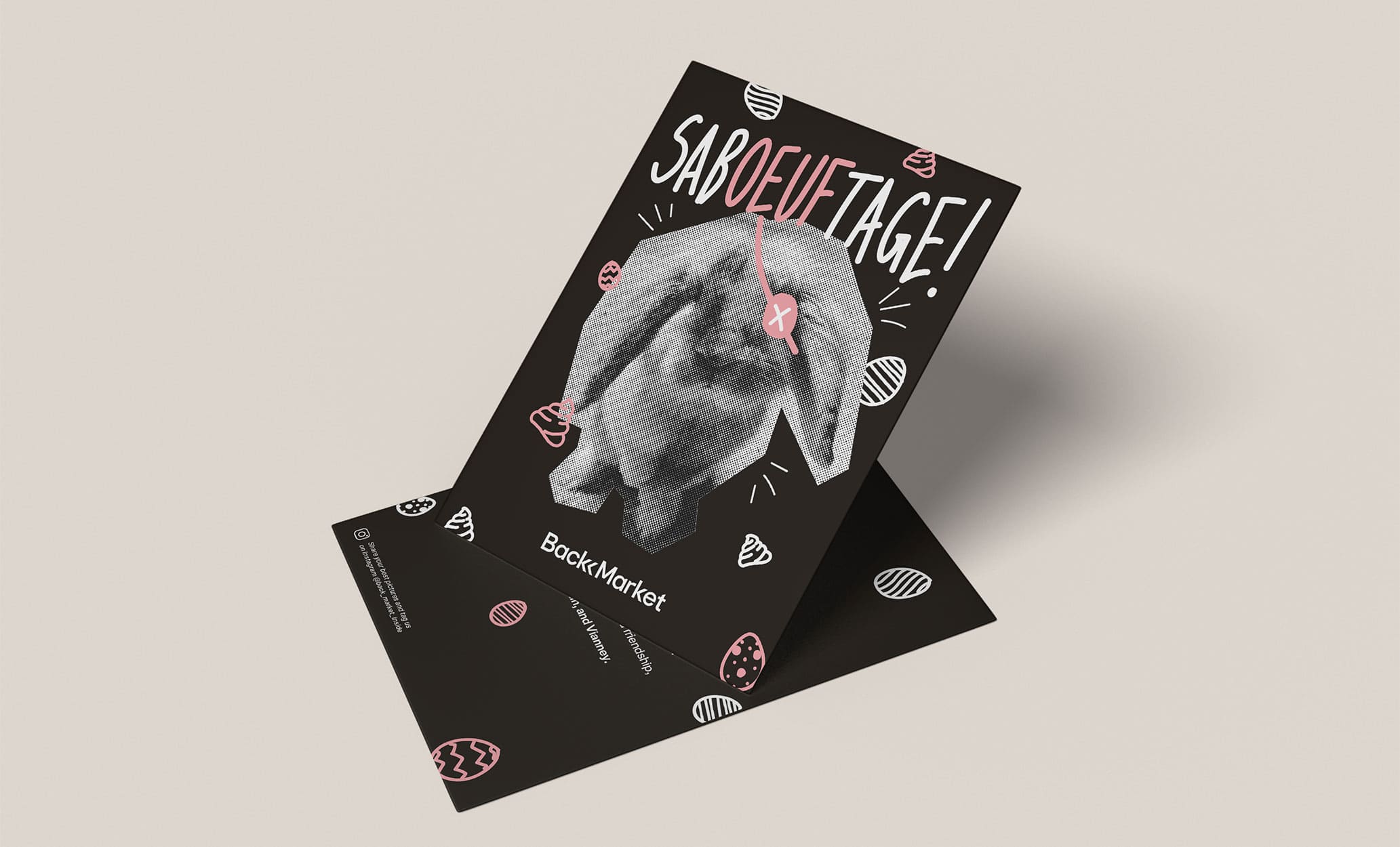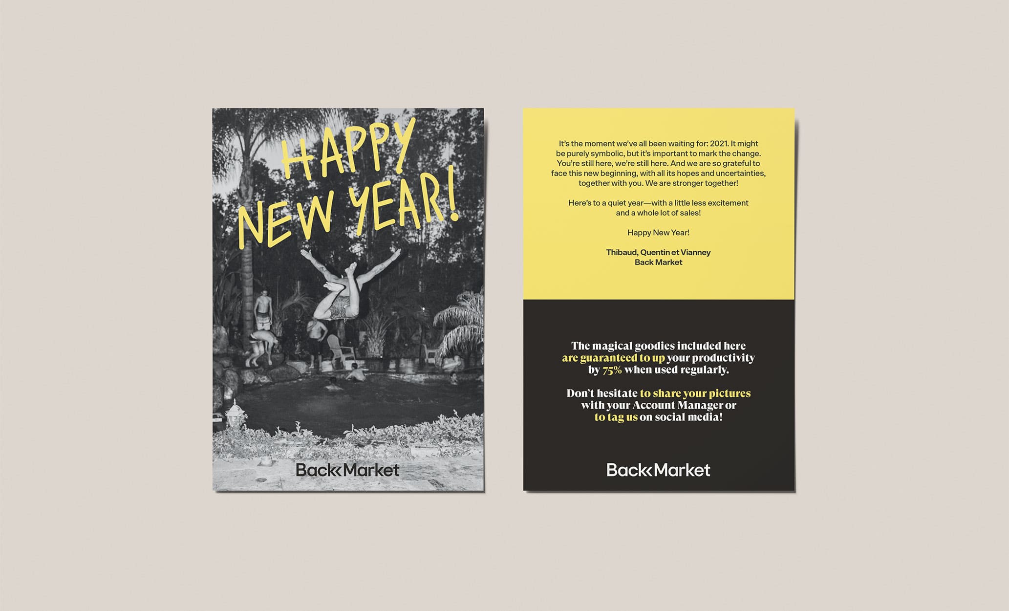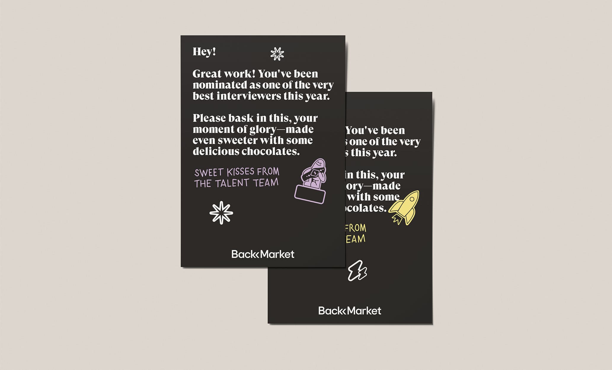 Cartes réalisées pour différents événements chez Back Market et offertes aux équipes, clients et marchands. (Nouvel an, Pâques, Faire-part de naissance, etc).